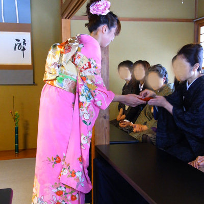 普段のお茶会ではあまりこういう振袖とか、派手めな盛り髪は見かけないんですが、それがこの「ひなまつり茶会」の特別なところv