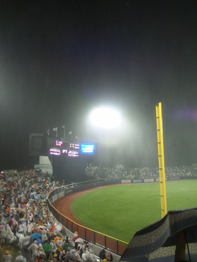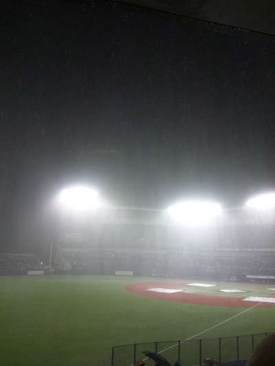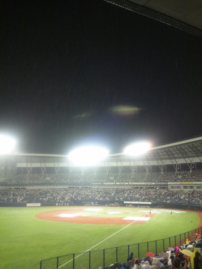 早々と盛り上がる球場の遠くから雷が光るのが見え初めた3回のあたり…